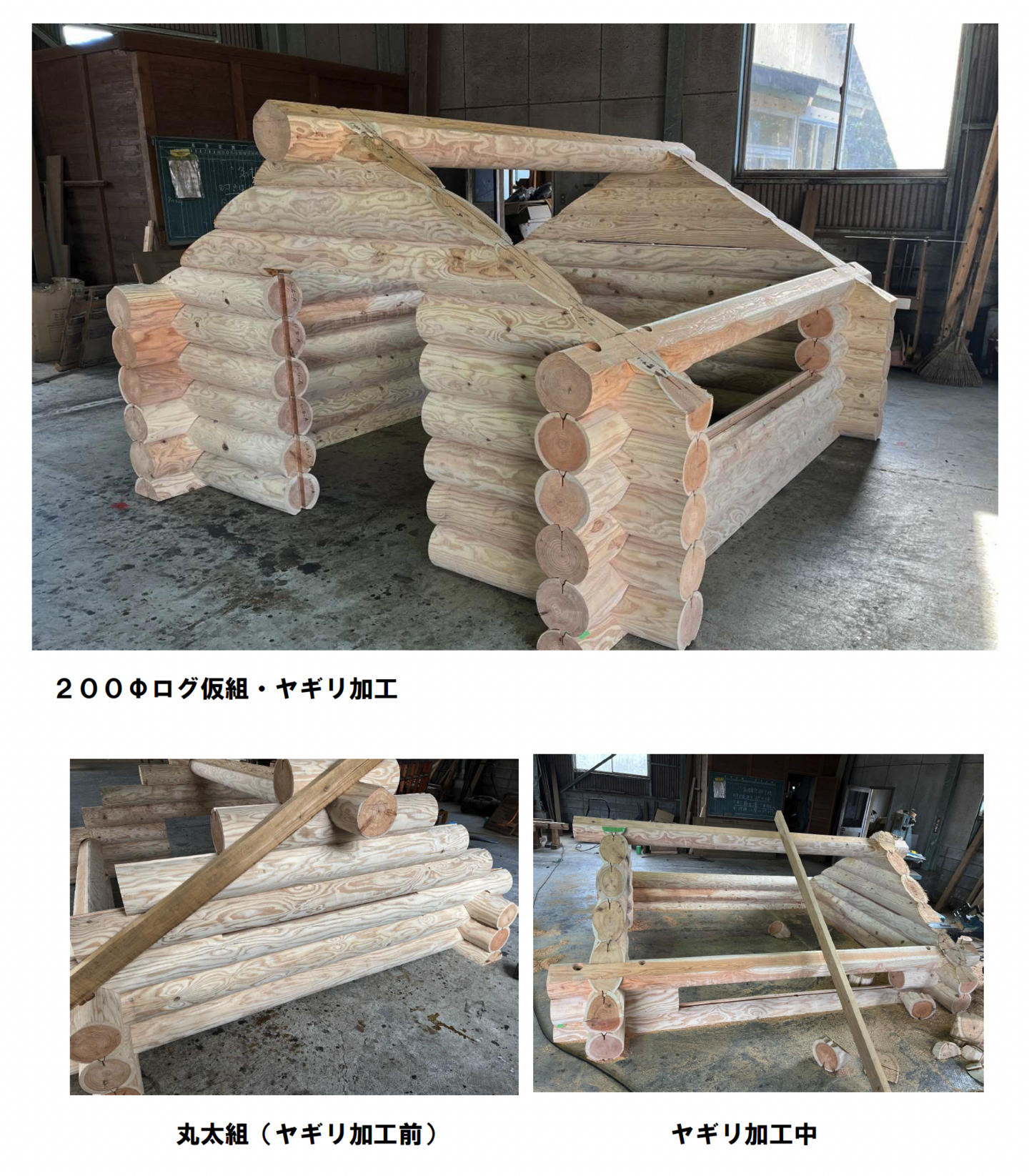 180Φ丸ログをライン加工終了後、窓加工・ボルト穴・電気穴を確認後仮組されます。