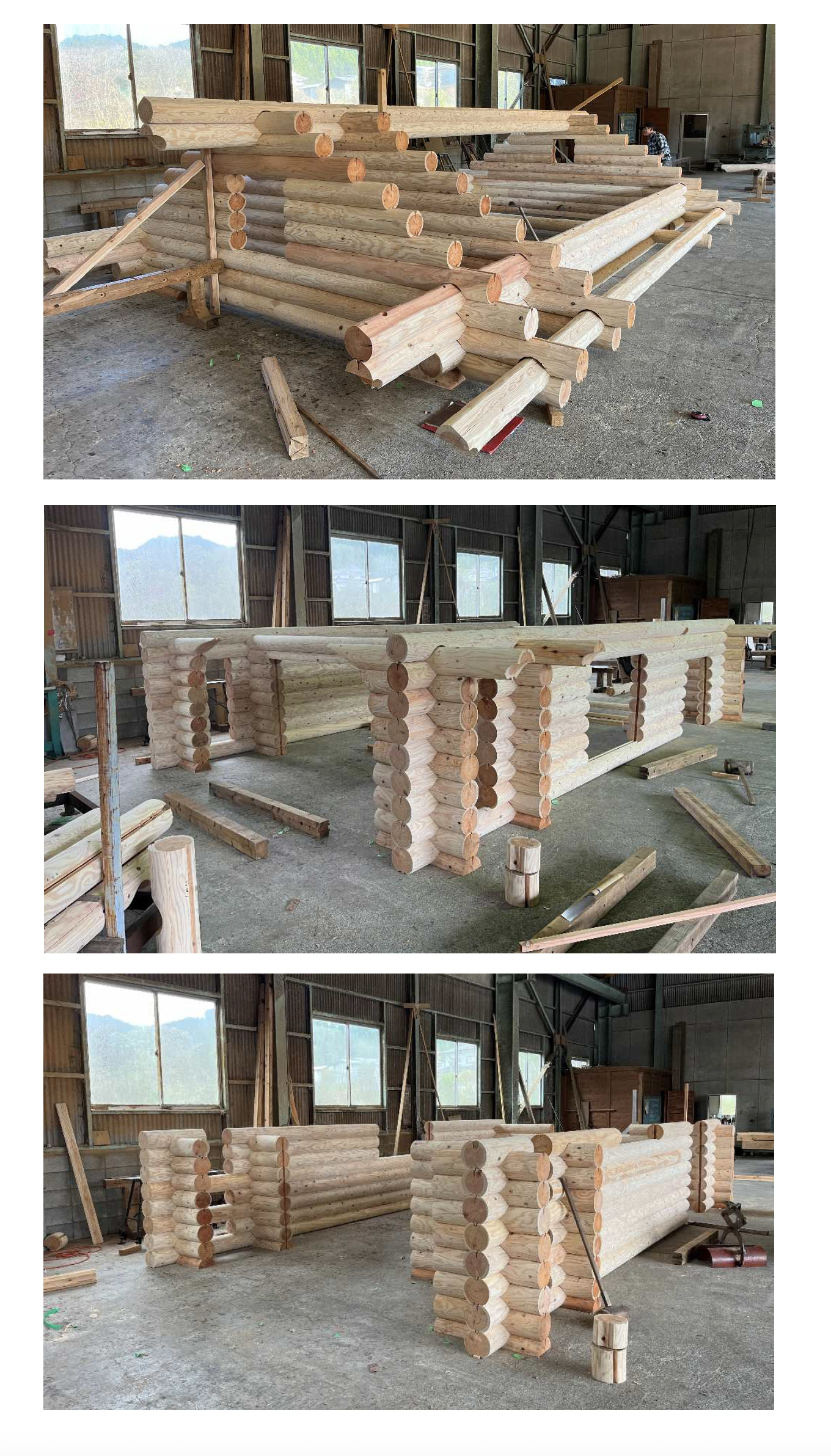 今回のログは棟まで26段あり9段分約1.5mに上段・中段・下段と三回に分けて仮組をしています。