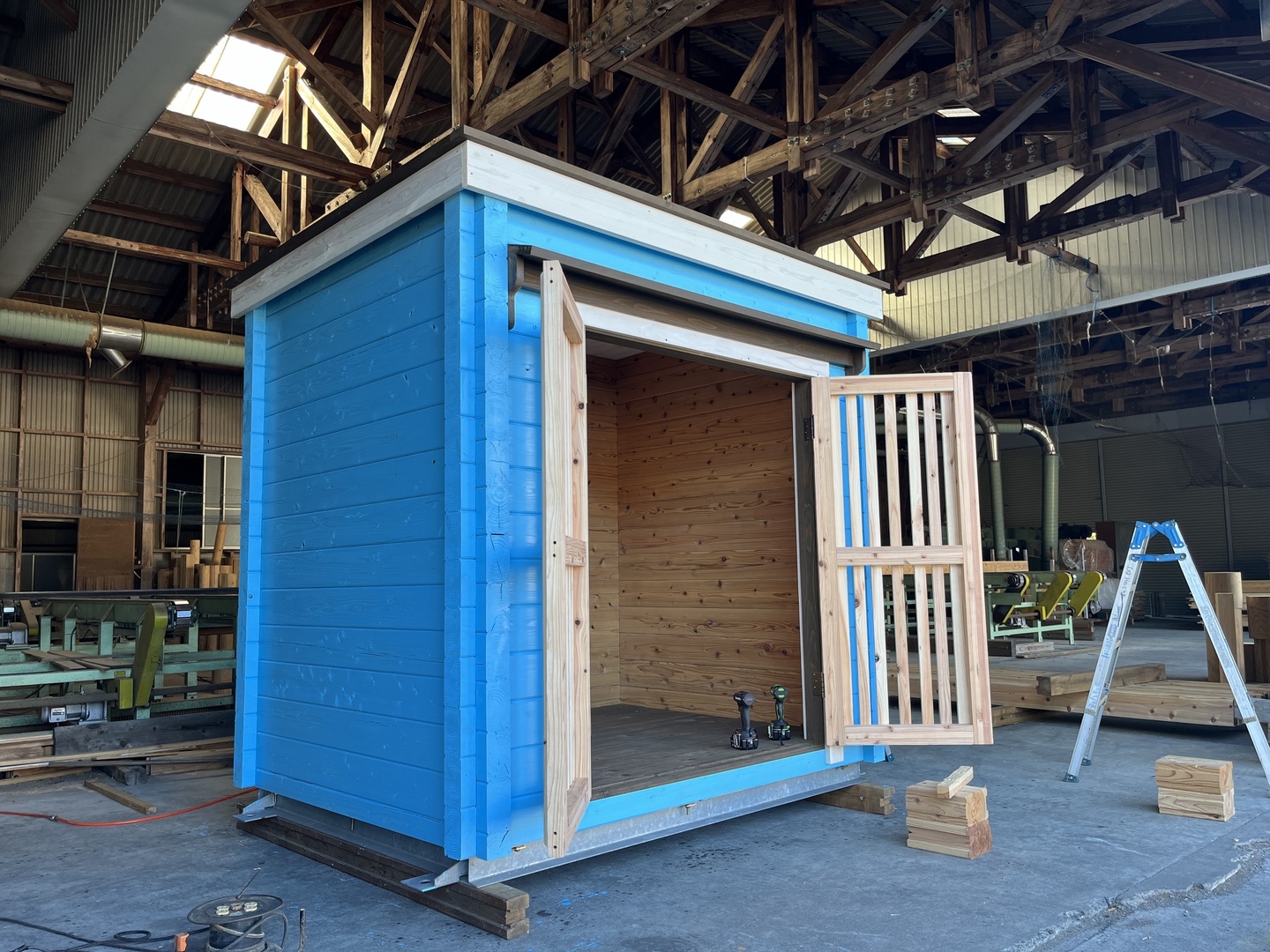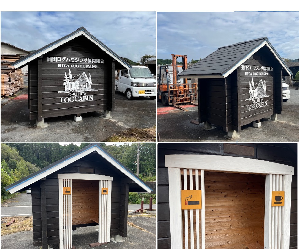 工場内にログハウス看板および休憩所・喫煙所を設置しました。ログハウスもいろんな活用方法がございます。皆さまからのご用命をお待ちしております。自社製材・加工だから自由自在でほぼ何でも可能ですよ!