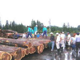 伐採された木は、現地での葉枯らしなどを経て、市内の原木市場で競りに掛けられます。