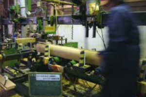 製材した原木をモルダーという4面に刃物のついた機械に通し、丸ログや角・Dログに成形します。